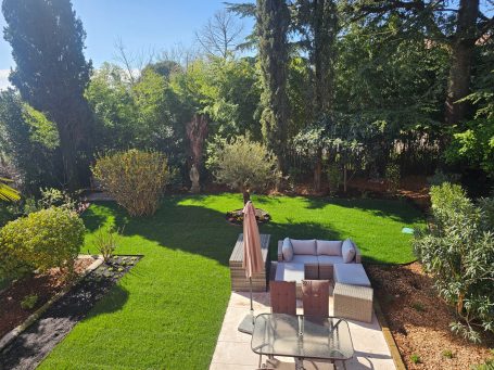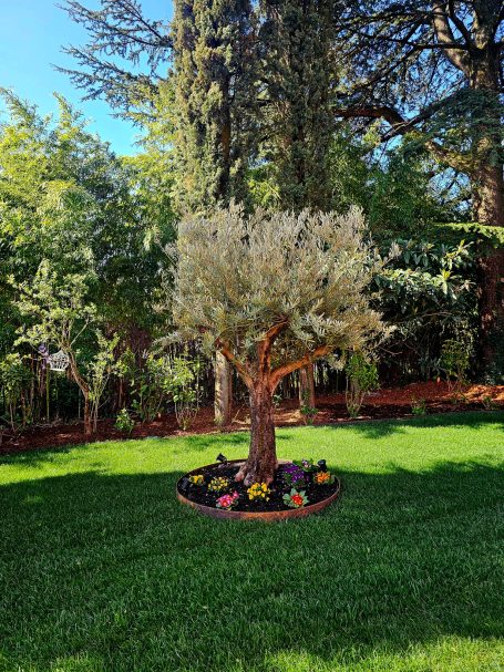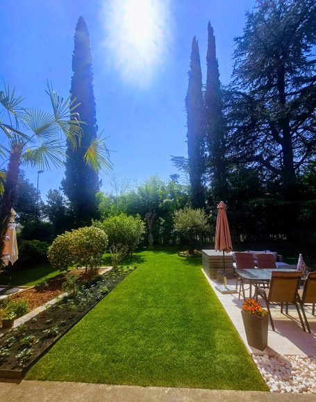 Die Gartenanlage mit üppigem Baumbestand bietet sonnige, aber auch schattige Plätzchen zum Verweilen. Mediterrane Pflanzen und Sträucher machen das Urlaubsfeeling perfekt.