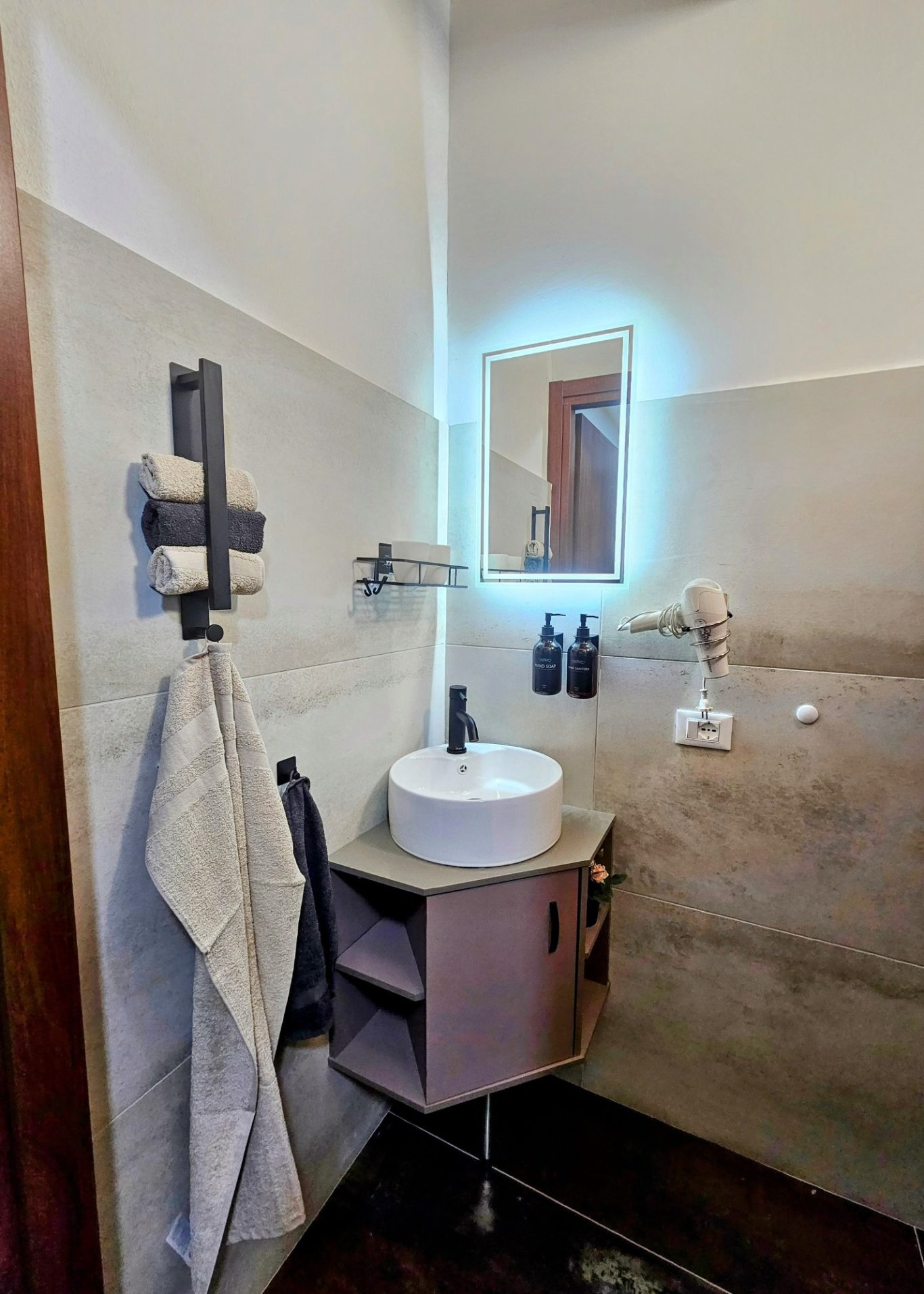 Waschtisch, LED Spiegel, Kosmetikspiegel, Fön, Desinfektionsmittel und Pflegeprodukte