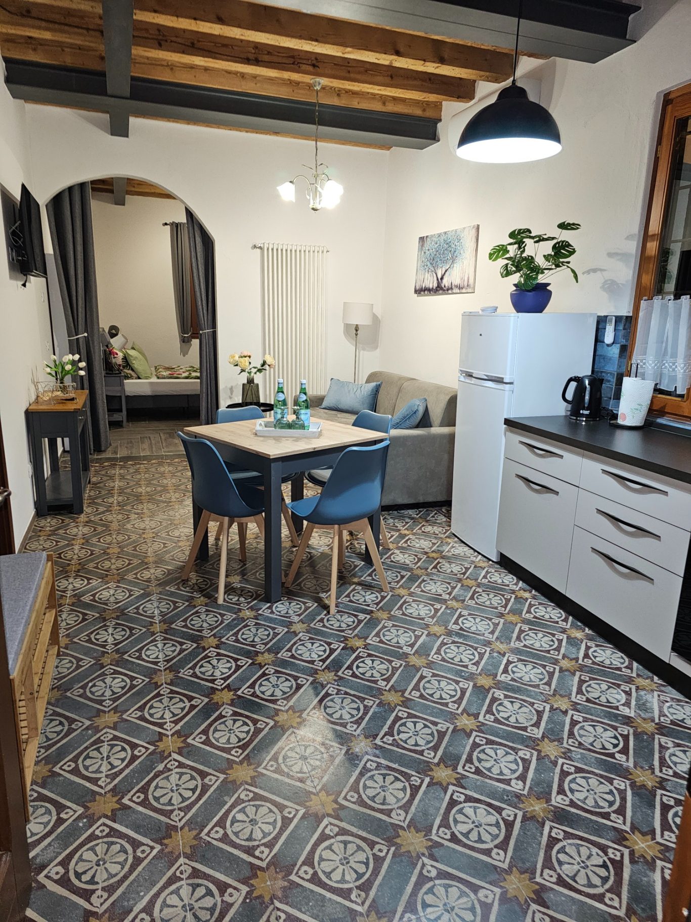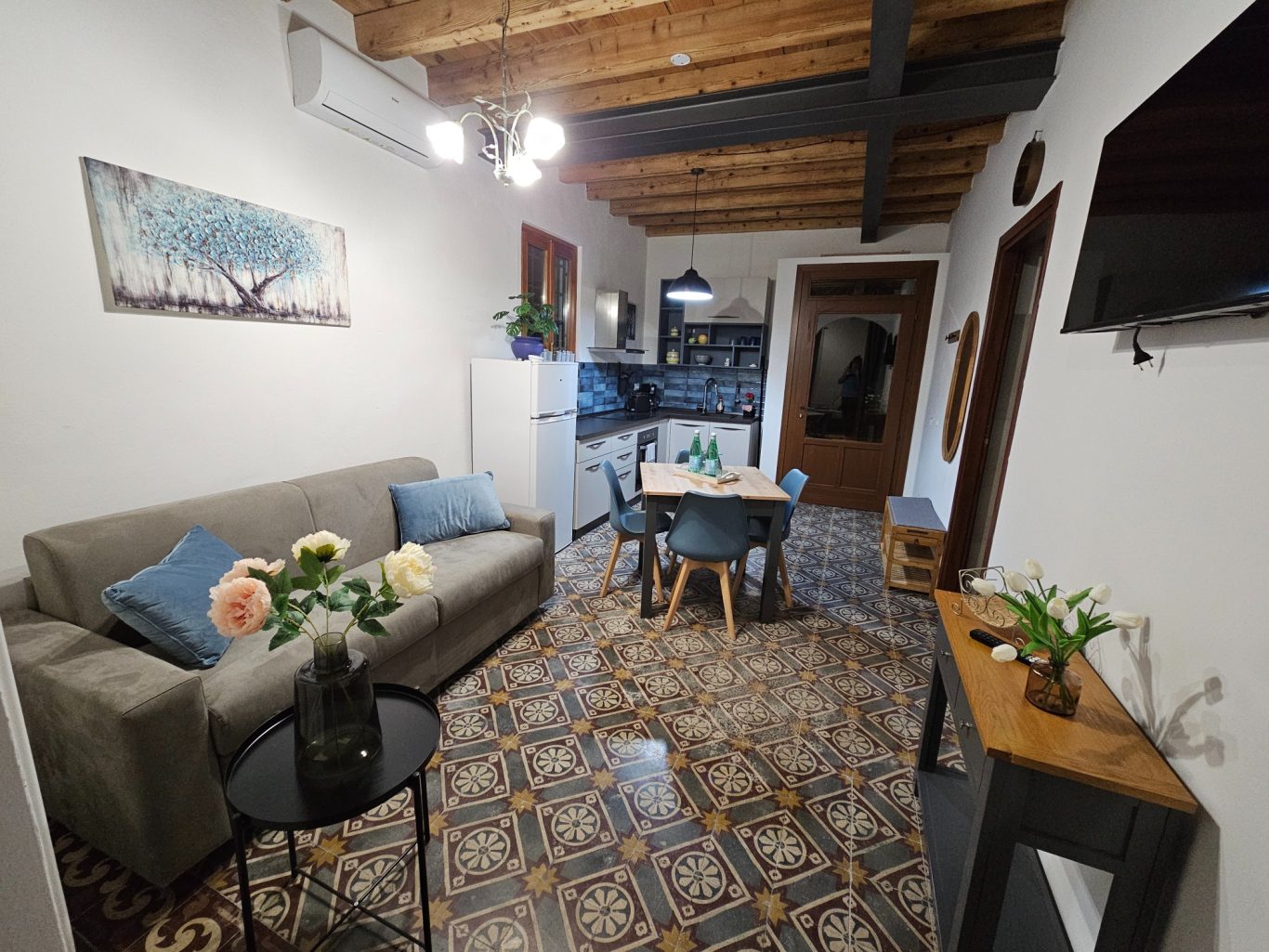 Das Wohnzimmer, indem sich ein vollwertiges Schlafsofa befindet, bietet Platz zum Verweilen. Es verfügt über ein 50" Smart TV (deutsche und italienische Sender) einer Küchen mit Essbereich.