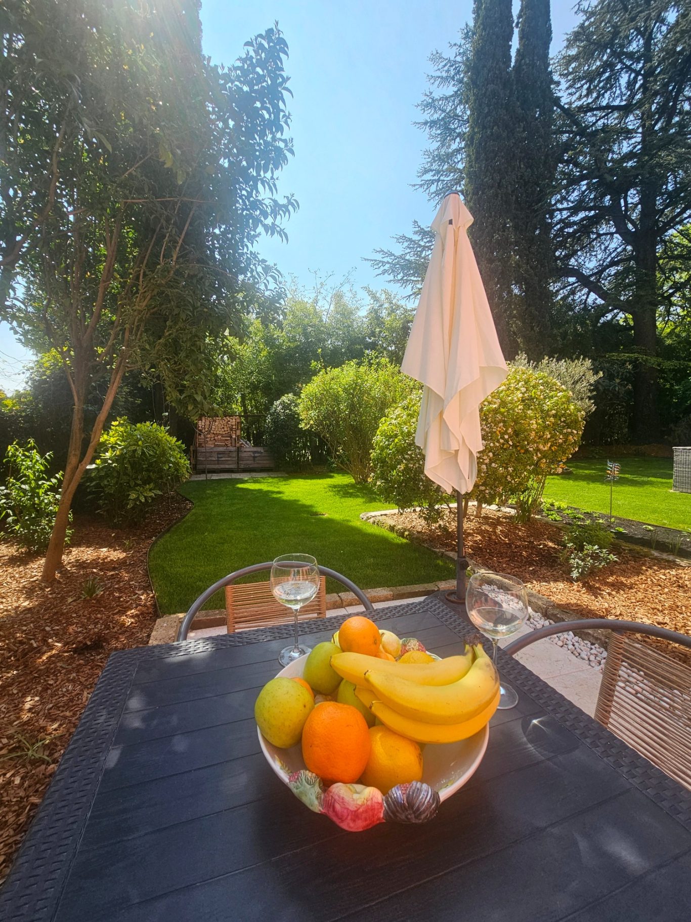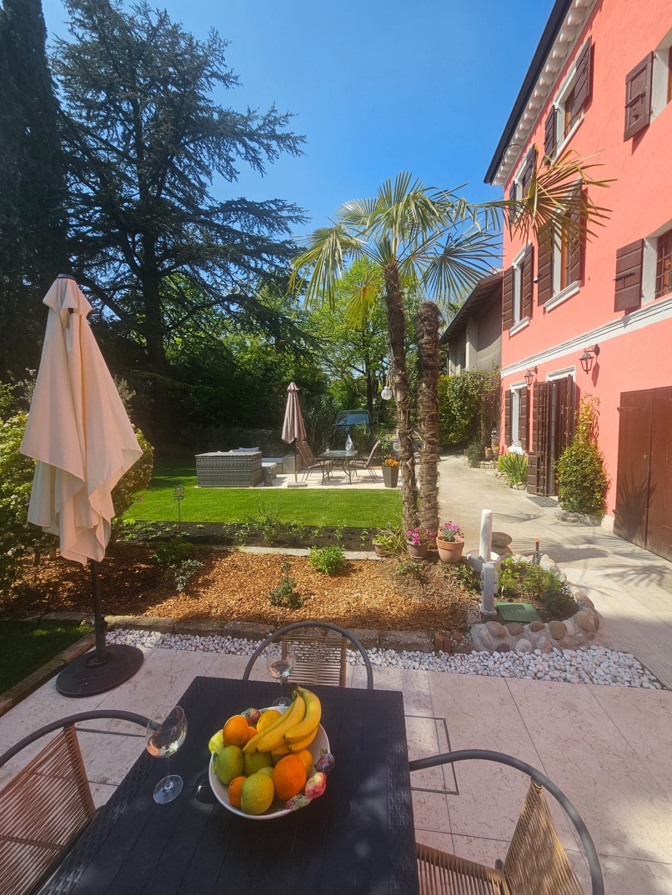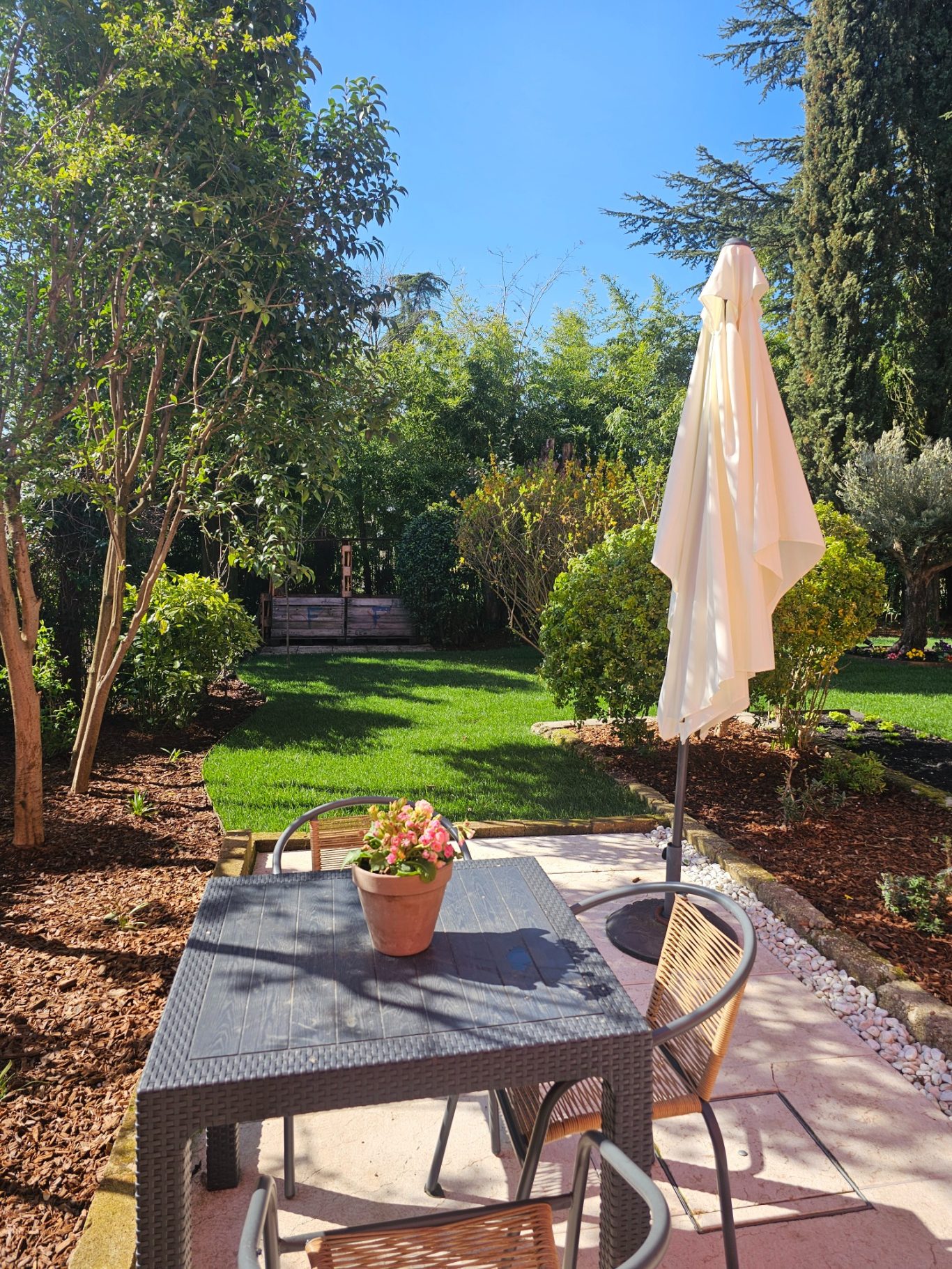 Essbereich mit Sonnenschirm und Gartenblick