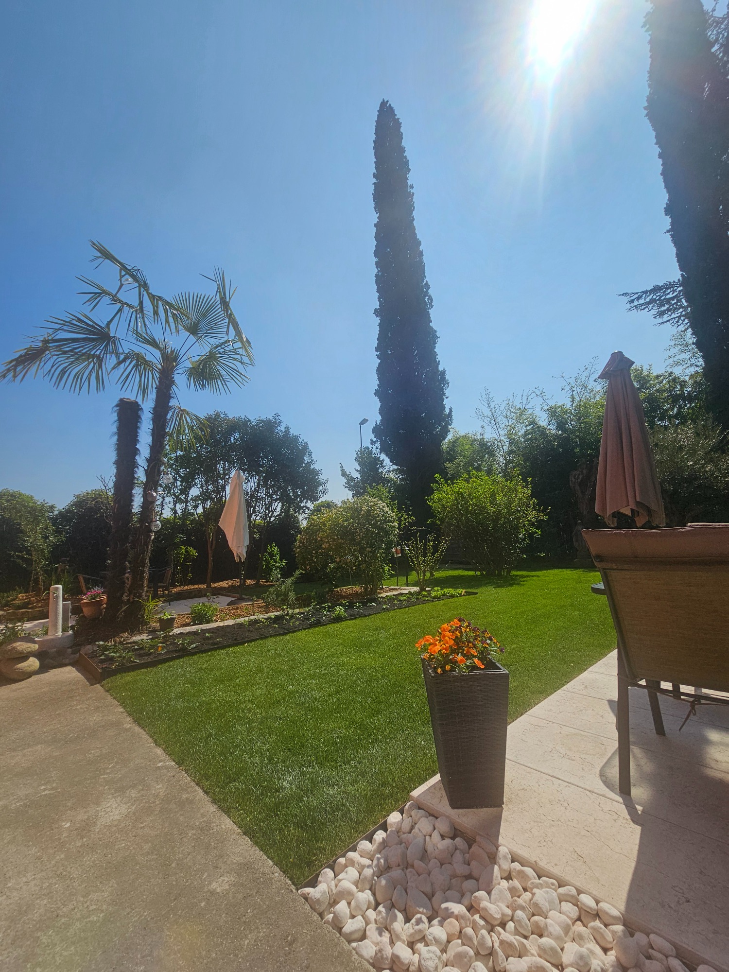 Essbereich mit Sonnenschirm und Gartenblick